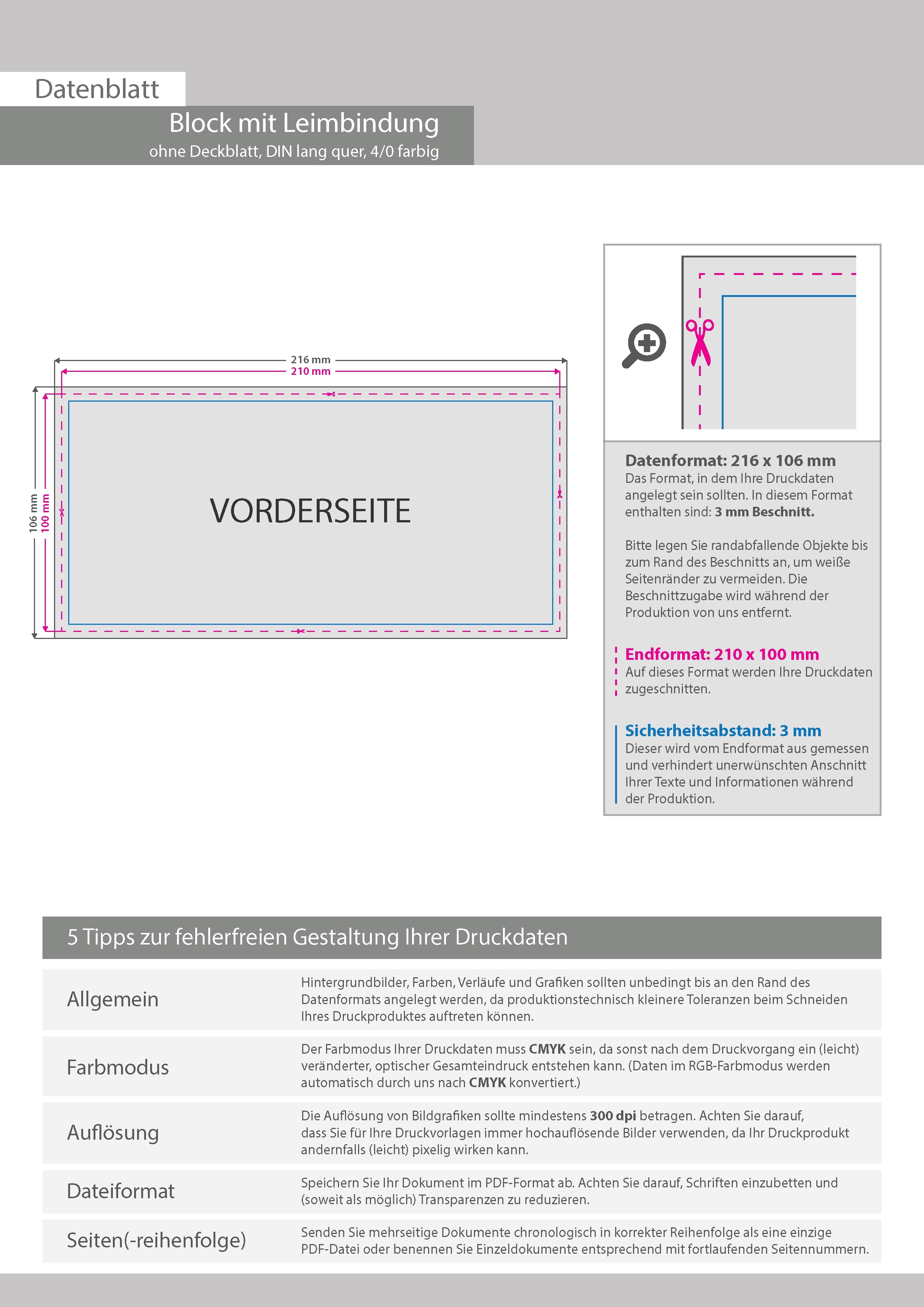 Block mit Leimbindung, DIN lang quer, 50 Blatt, 4/0 farbig einseitig bedruckt