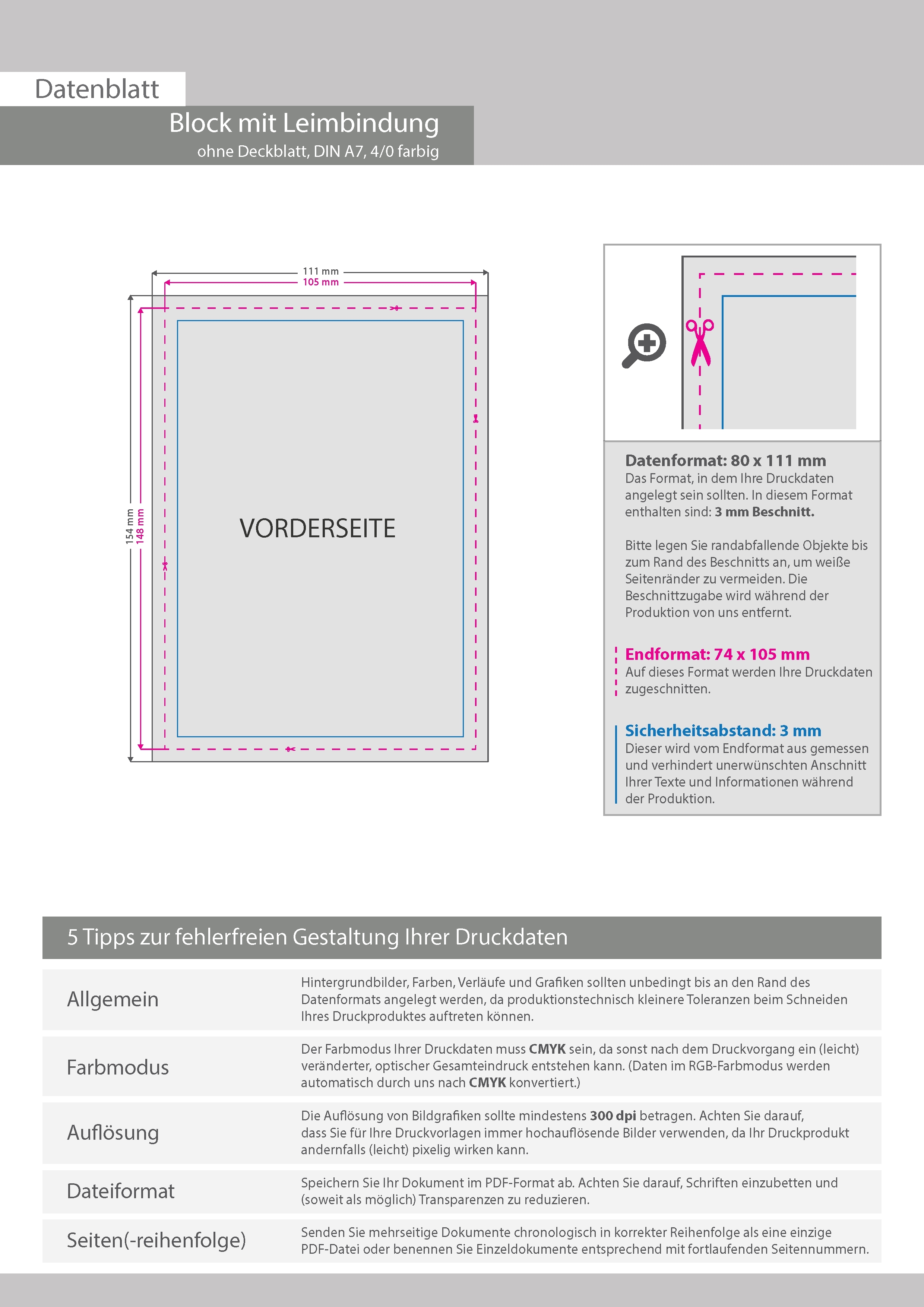 Block mit Leimbindung, DIN A7, 25 Blatt, 4/0 farbig einseitig bedruckt