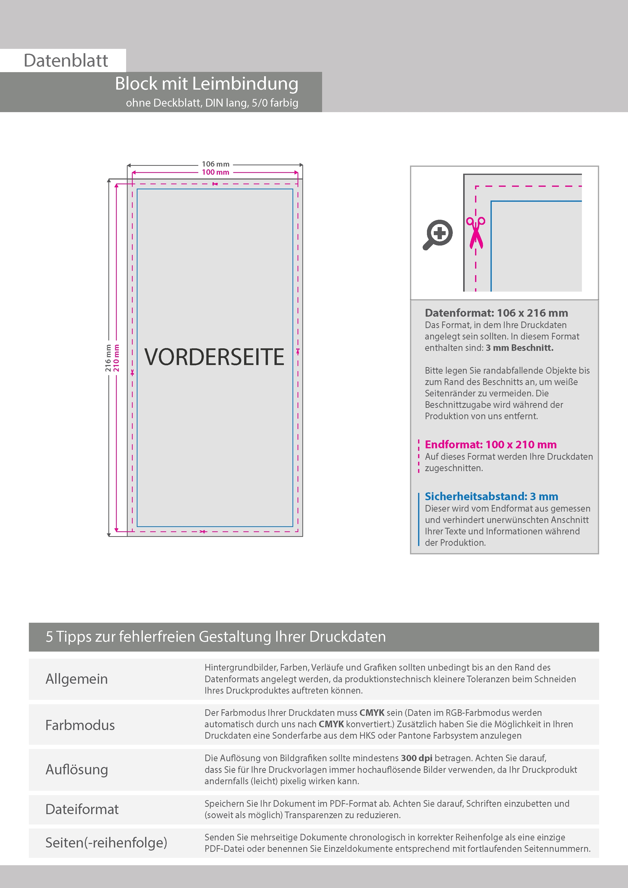 Block mit Leimbindung, DIN lang, 10 Blatt, 5/0 farbig einseitig bedruckt (CMYK 4-farbig + 1 Sonderfarbe HKS oder Pantone)