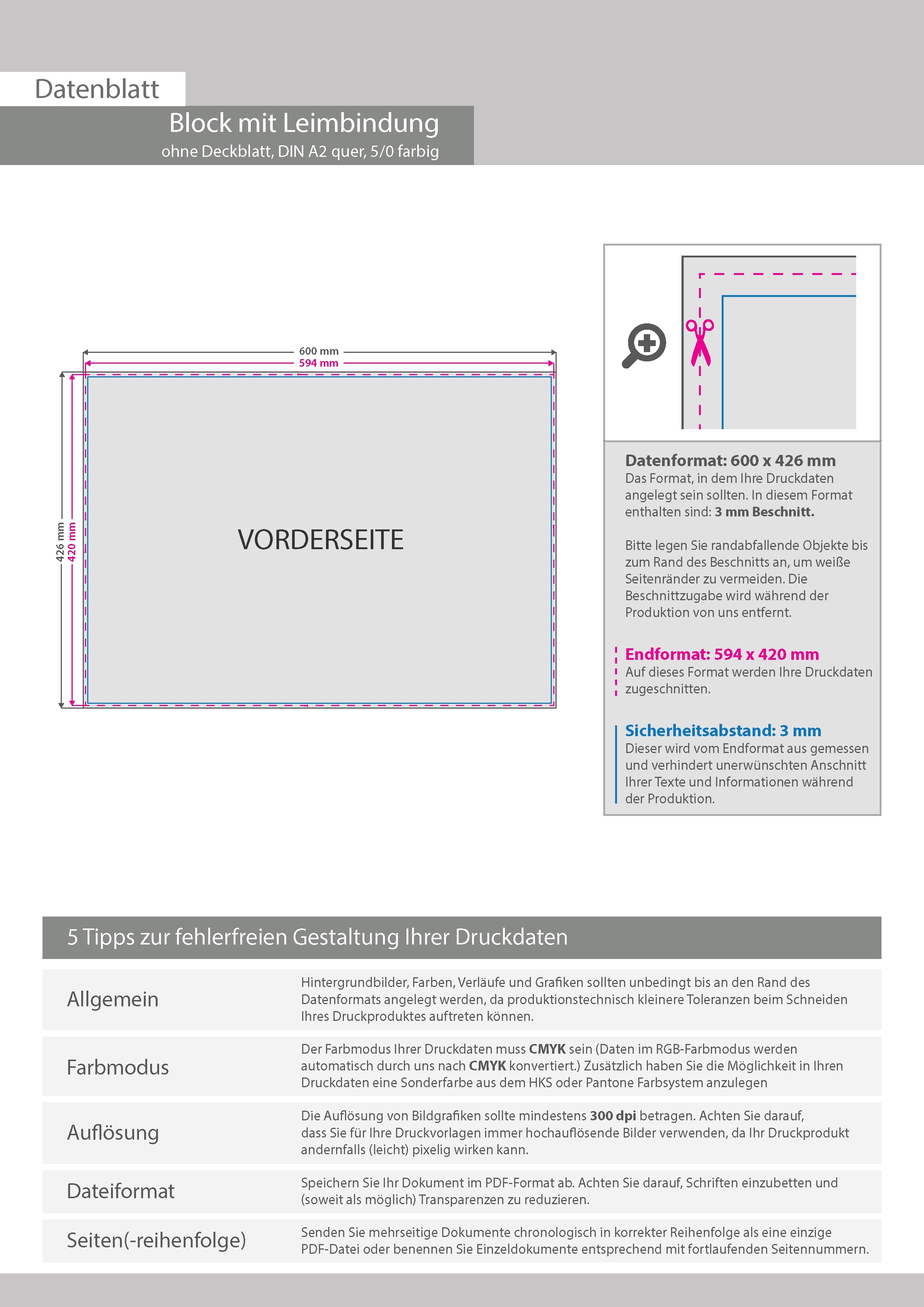 Block mit Leimbindung, DIN A2 quer, 10 Blatt, 5/0 farbig einseitig bedruckt (CMYK 4-farbig + 1 Sonderfarbe HKS oder Pantone)