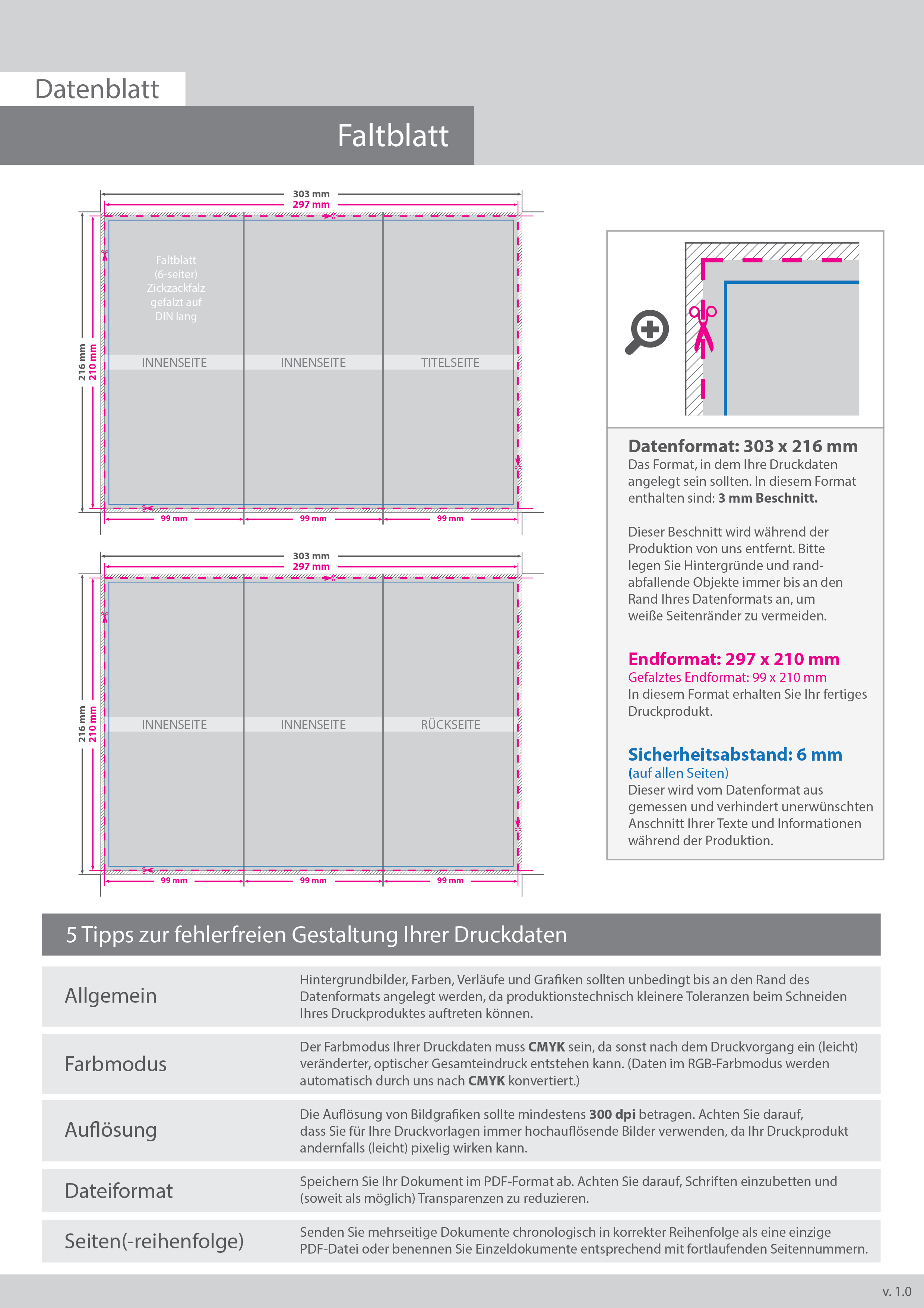 Faltblatt, gefalzt auf DIN lang, vertikaler Zickzackfalz, 6-seitig