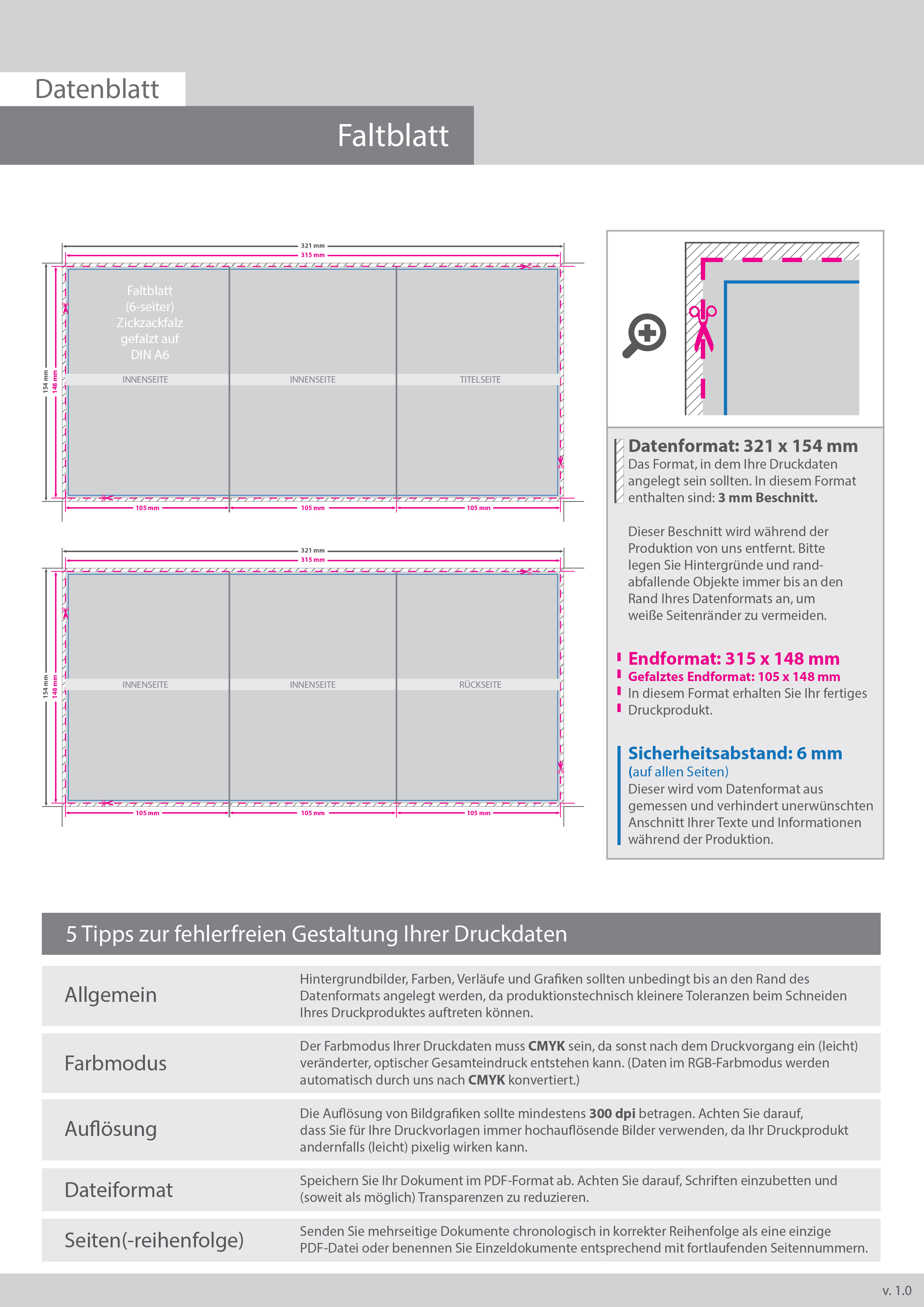 Faltblatt, gefalzt auf DIN A6, vertikaler Zickzackfalz, 6-seitig