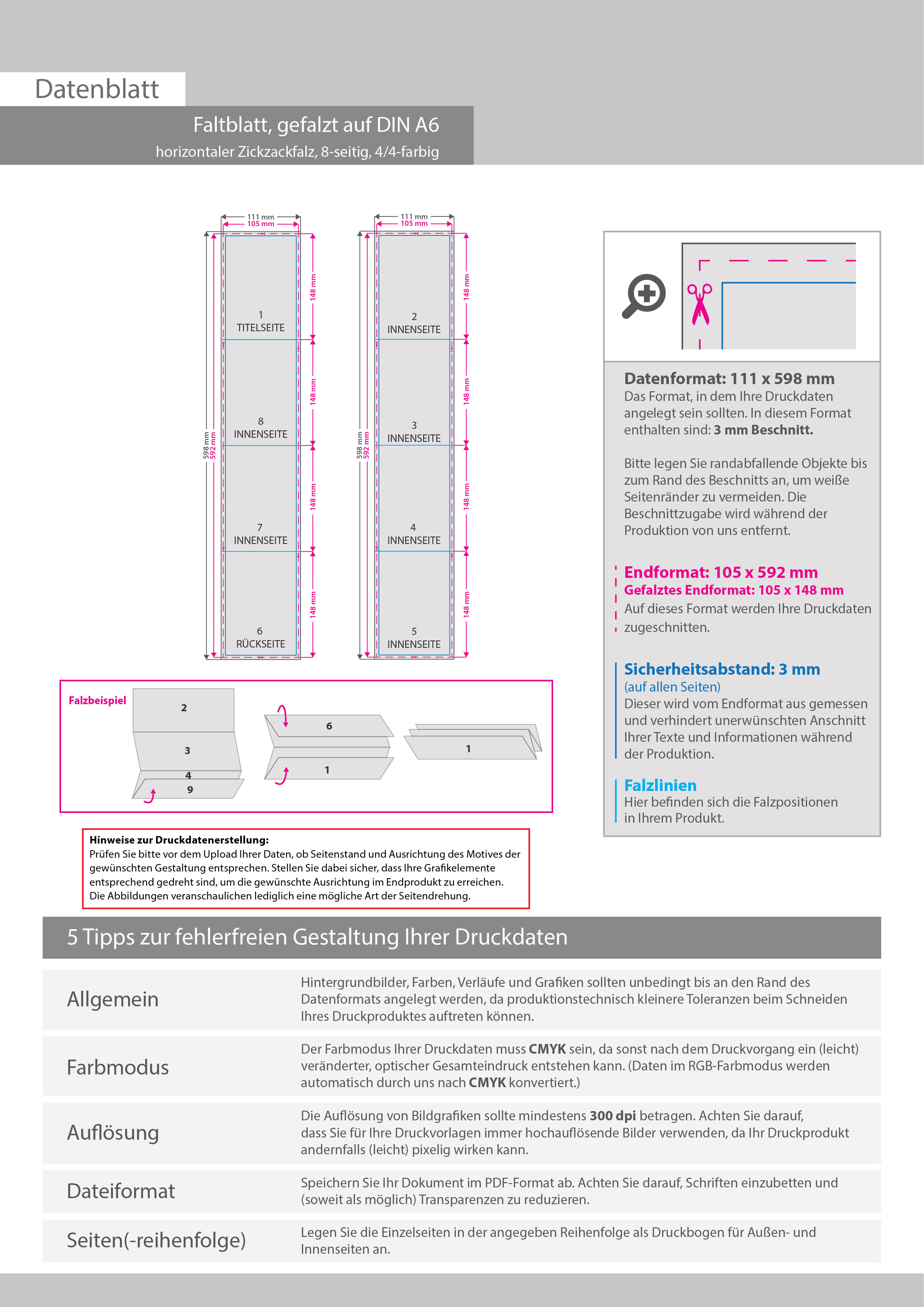 Faltblatt, gefalzt auf DIN A6, horizontaler Zickzackfalz, 8-seitig